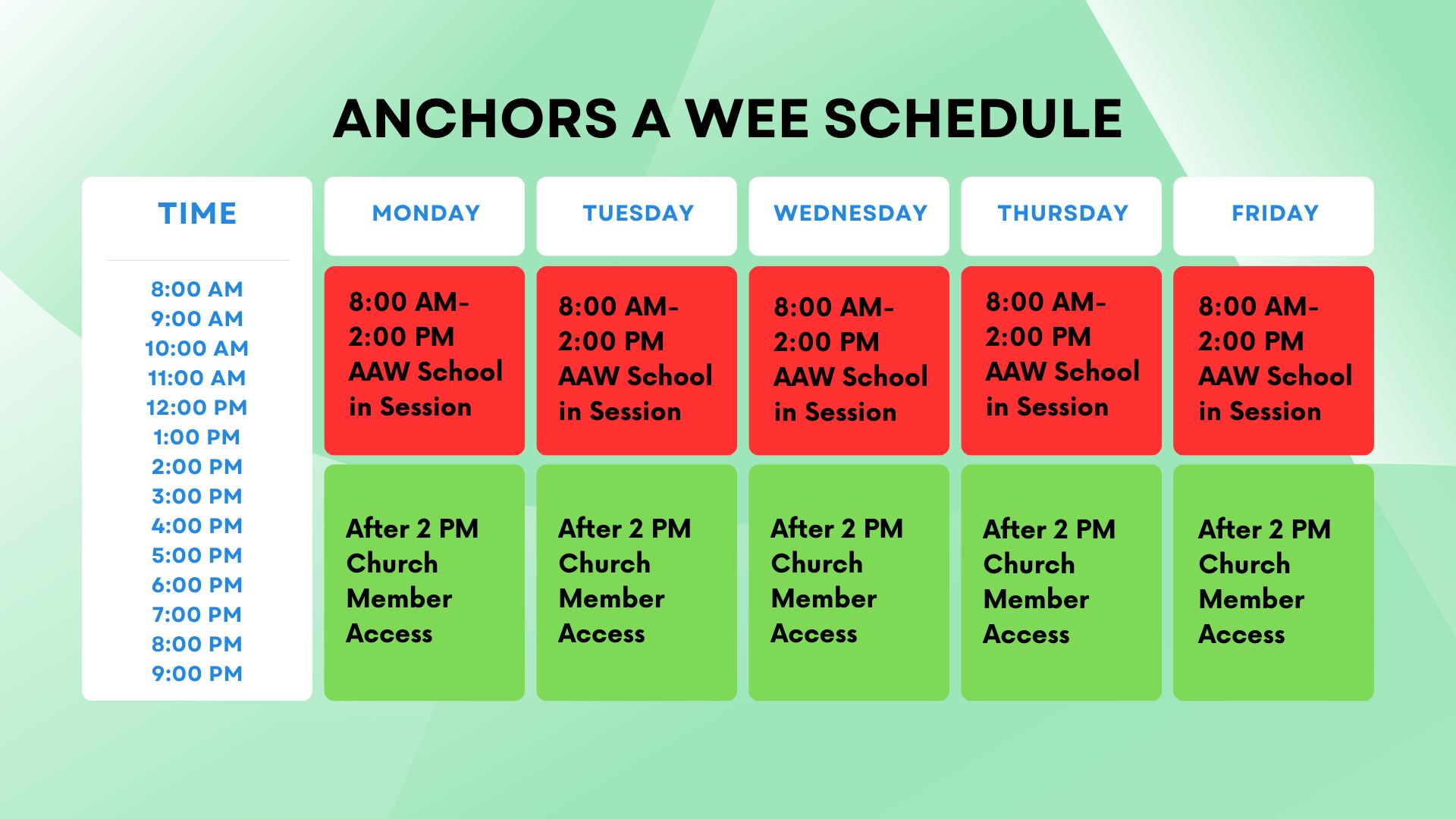 Why do I need to check the schedule? Anchors-A-Wee is open Monday through Friday and we are required to comply with state child safety and security regulations (COMAR). Additionally, Anchors-A-Wee is subject to a surprise state inspection, which occur this fall.