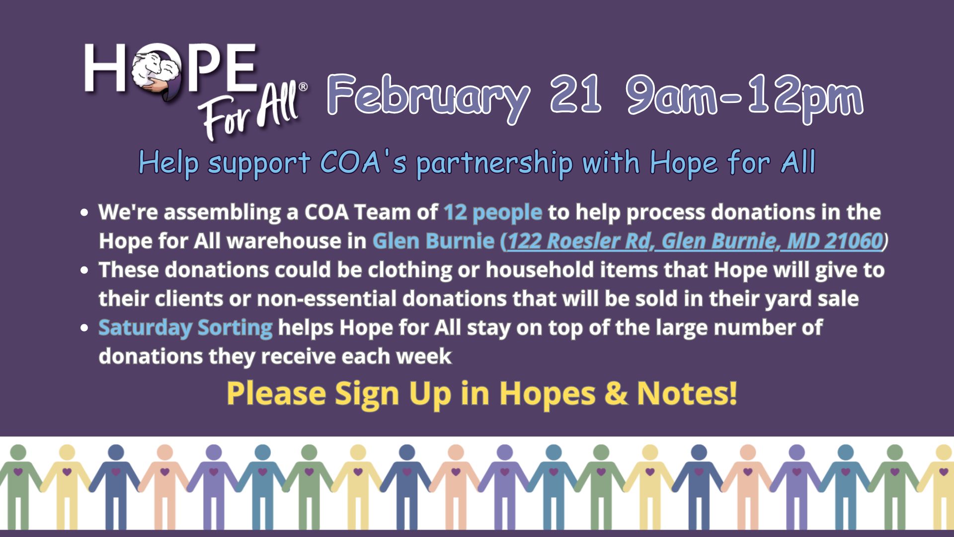 COA is taking a group up for a warehouse sorting day. Come join us using the sign up here,