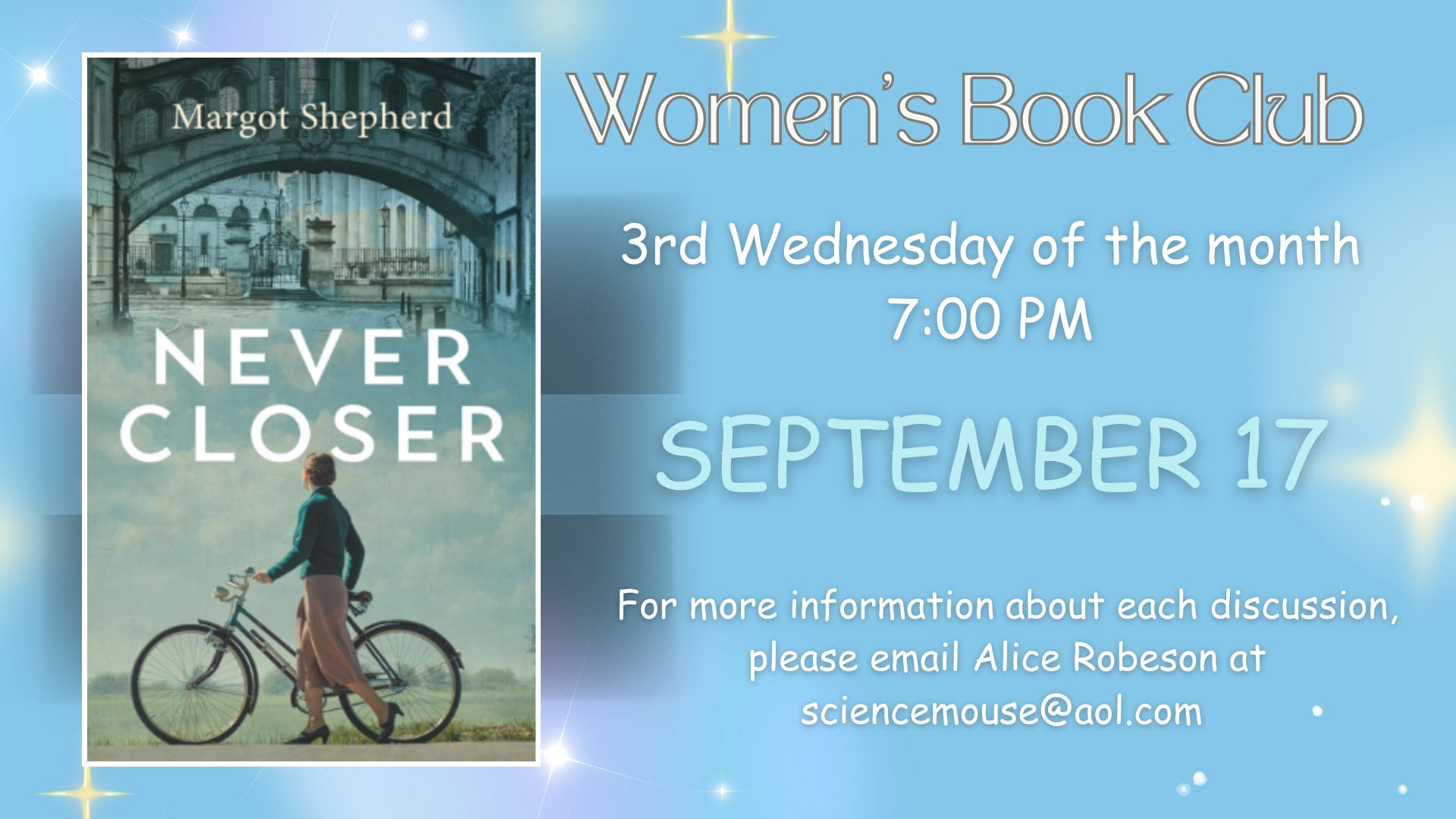 - September 17th – Never Closer by Margot Shepherd, discussion leader and host Alice Robeson