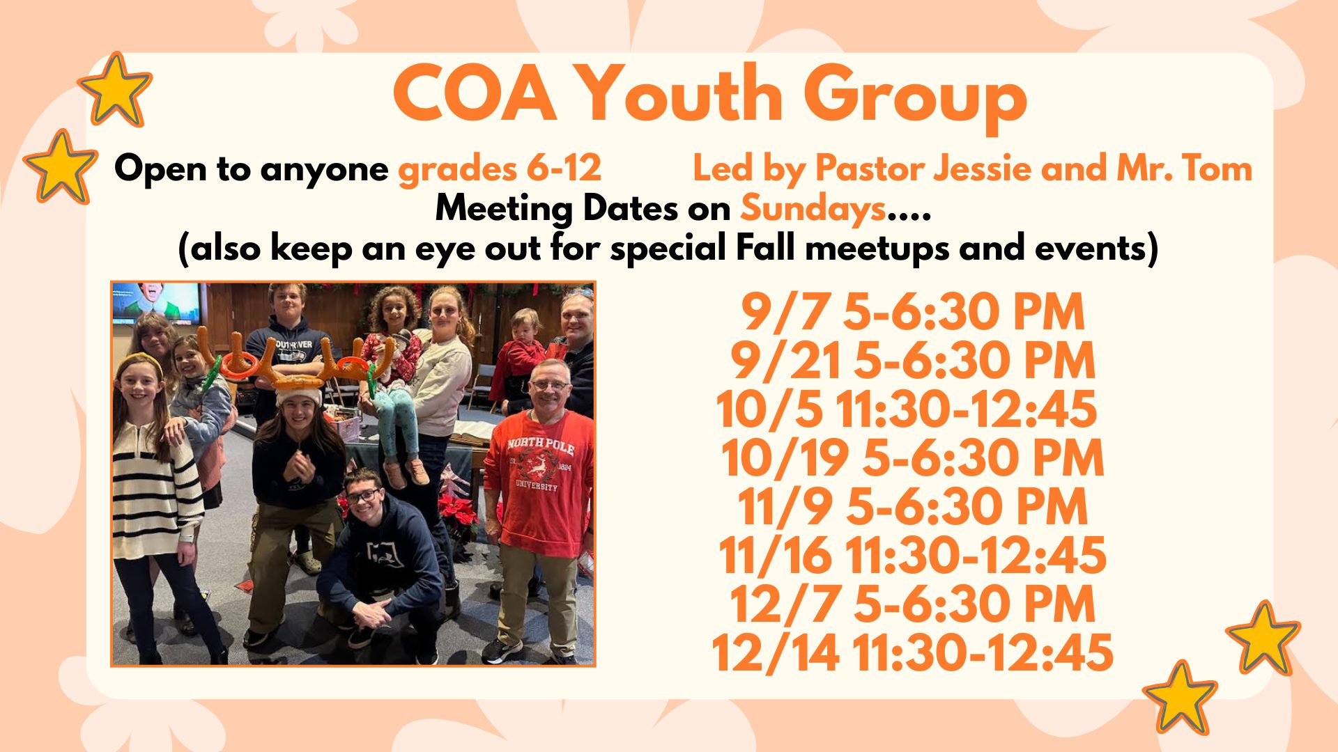 Youth Group is a place for youth in grades 6-12 to come and grow their faith together in an open and safe space.